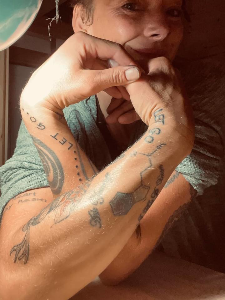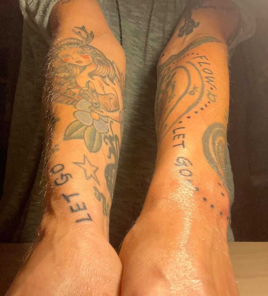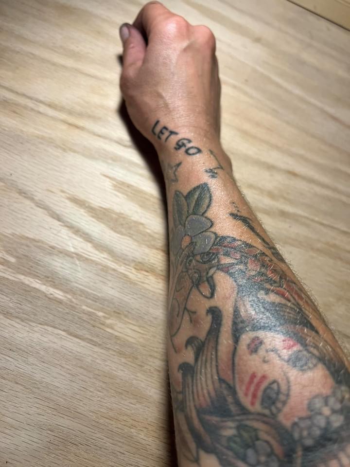 Took Almost 4 hours of meticulous tattooing to do my right wrist ‘Let Go’ ( definitely trickier using the needle with my left hand 😮) ….along with ‘Flow’ on the left arm above the ‘let go’ from a few days ago. I also added 41 dots, as a birthday ritual to honor the 41 years of Living as this Particular me in this Particular Dream . Not too shabby, methinks