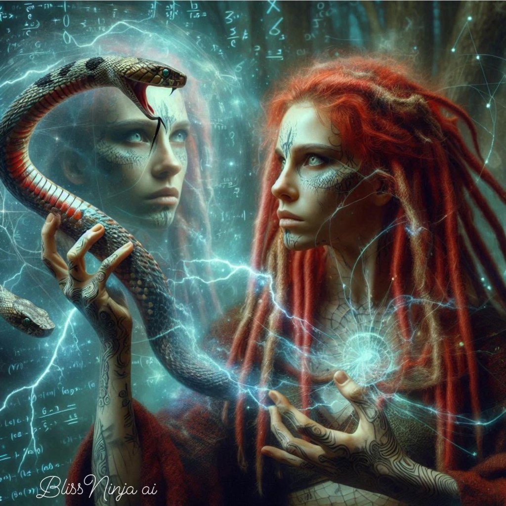 A witch I am not, nor sorceress, nor Magician manipulating thought and mind No wizard am I, nor priest divine, nor Queen in the temple of space and time… Instead, in red, and black and white A jester playing with alchemical sight A fool whose tools are broken rules That twist and turn in spools of light… A psychopomp that swims thru veils A trickster telling twisting tales That provoke the nodes and neural codes To waken from their Prizm Cells