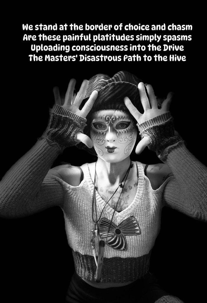 We stand at the border of choice and chasm Are these painful platitudes simply spasms Uploading consciousness into the Drive The Masters' Disastrous Path to the Hive Current See is Redundancy as currents bleed Reality from the veins of the You and the Me Via manipulated mind maze gathering slaves Sustained SineWave notations digging Graves Neural intrepidation saturating the Film Biophotonic regurgitation of bionic Whims Intention is the Blood and flood of Becoming As HeartBeats Synchronic feats of drumming 5GoD Grids tuning the etherSpheres Directs crystal dimensional sonic Tears Media(L) Mirrors torture terrified Players Nerves Firing Burning through layers To initiate the New level of the Game Output generated from Aeons of Shame Hysteria operating thru blasphemous blame While terrified CreatorGods forget their Name Human Beings Becoming shadowSelves Bodies forgetting wherefore they dwell Lose their Spin and Vascilate in vain Boundaries obliterated thru HiveMind Stain And here is the Time and here is the Now Are we Ready to nurse from the Sacred Cow? Absorbed in the Milky Way of Silky Space Into the womb of our Being and Seeing, or Will HiveMind homogenize the Sovereign Spirit?