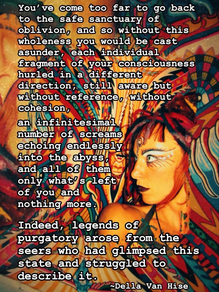 You’ve come too far to go back to the safe sanctuary of oblivion, and so without this wholeness you would be cast asunder, each individual fragment of your consciousness hurled in a different direction, still aware but without reference, without cohesion, an infinitesimal number of screams echoing endlessly into the abyss, and all of them only what’s left of you and nothing more. Indeed, legends of purgatory arose from the seers who had glimpsed this state and struggled to describe it.